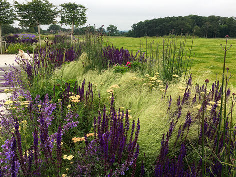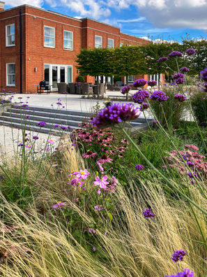 The once muddy field has been transformed into a multi-level space with water rills, dining and chill out areas, including a sunken lounge area which is surrounded by lush, fragrant planting; perfect for the pollinators. Within hours of planting, the garden hummed to the sound of bees. The large borders break up the patio area and the repeat plantings give the garden a sense of cohesion. The pleached trees were added to provide height and structure